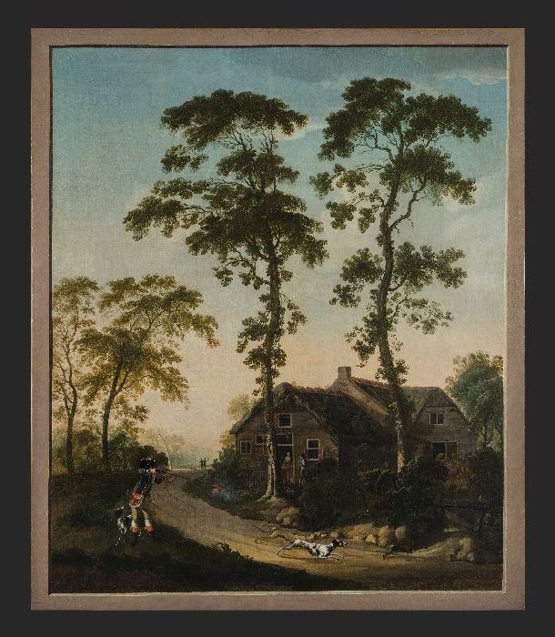 Arcadisch lokaal landschap met huis aan pad en jager...