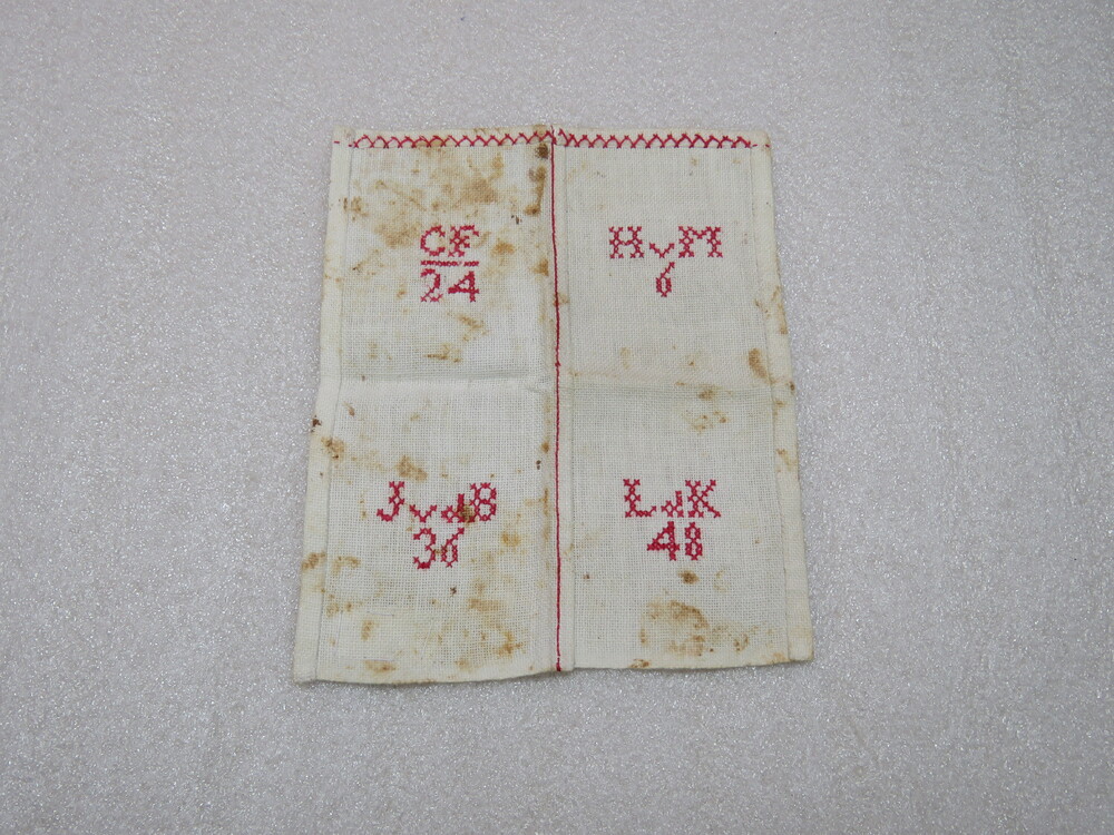 proeflap met initialen en cijfers vervaardigd door l...