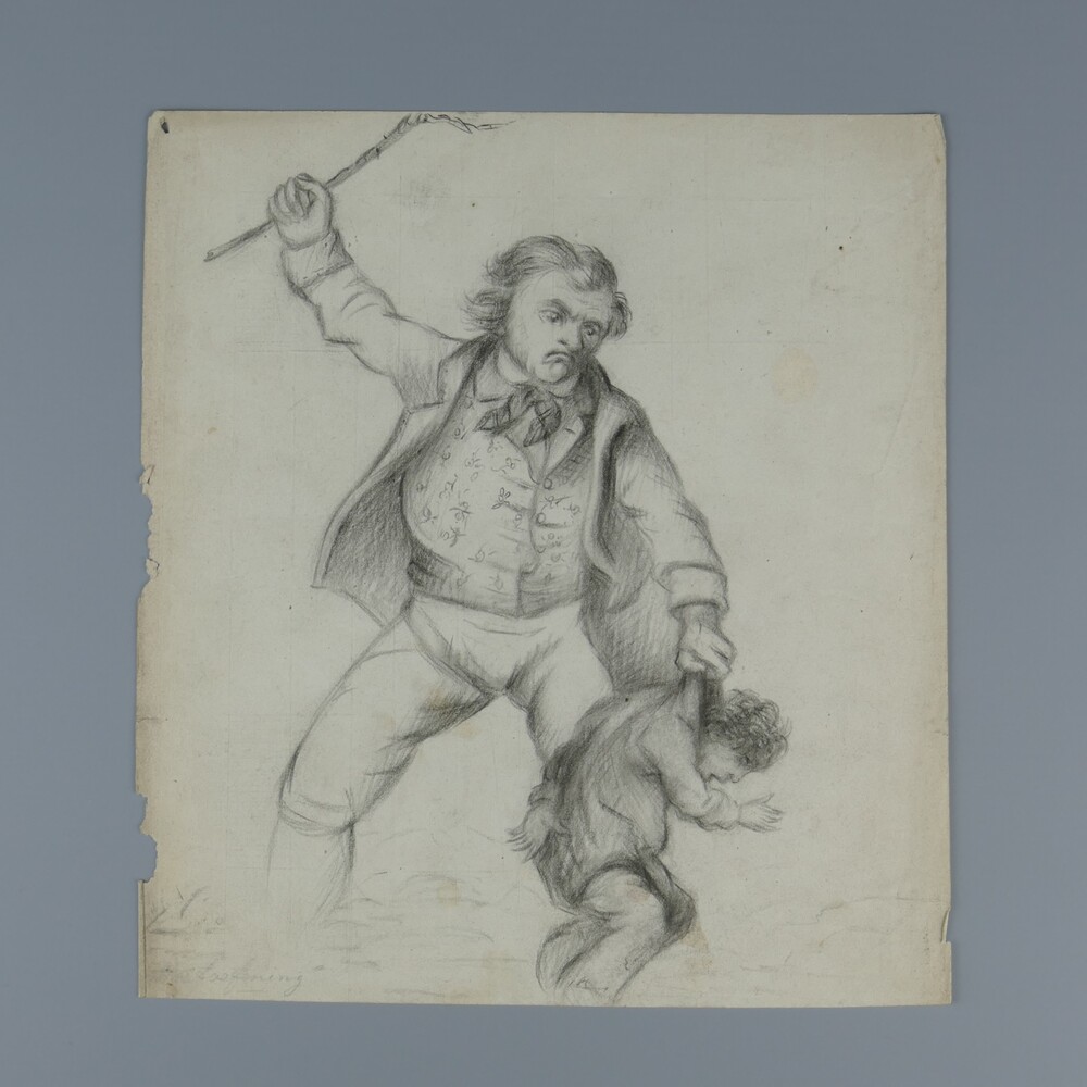 Potloodtekening op papier voorstellende man met stok...
