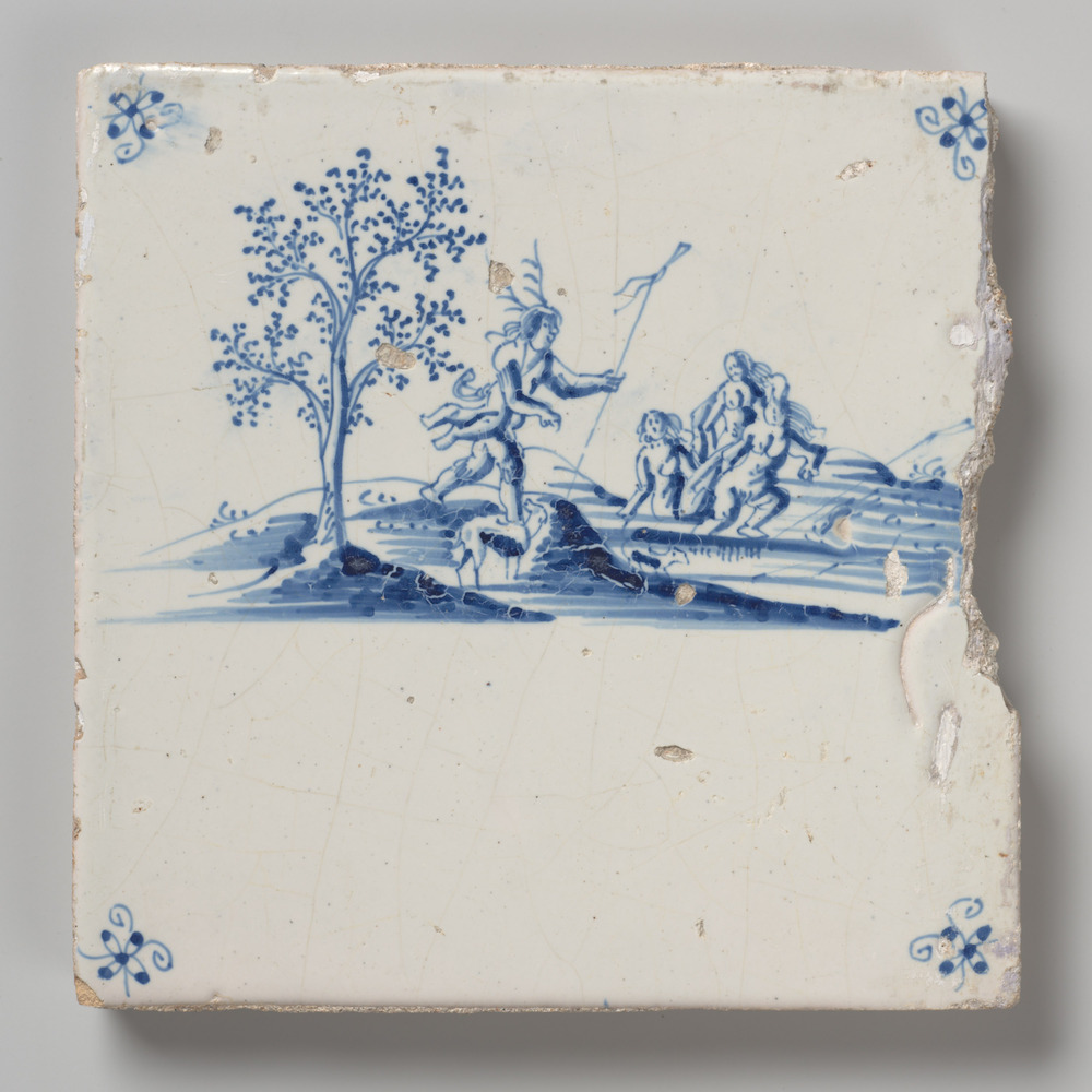 tegel van aardewerk met tinglazuur, voorstellende: A...