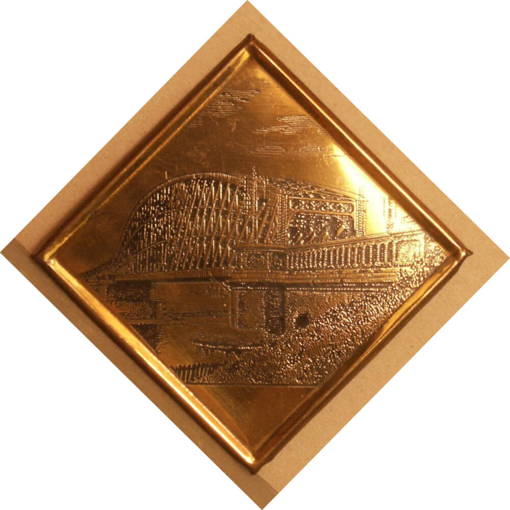 bord, vierkant, van koper met afbeelding van de oude...