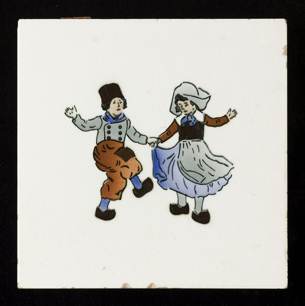 Tegel in onderglazuur, met voorstelling: Dansend boe...