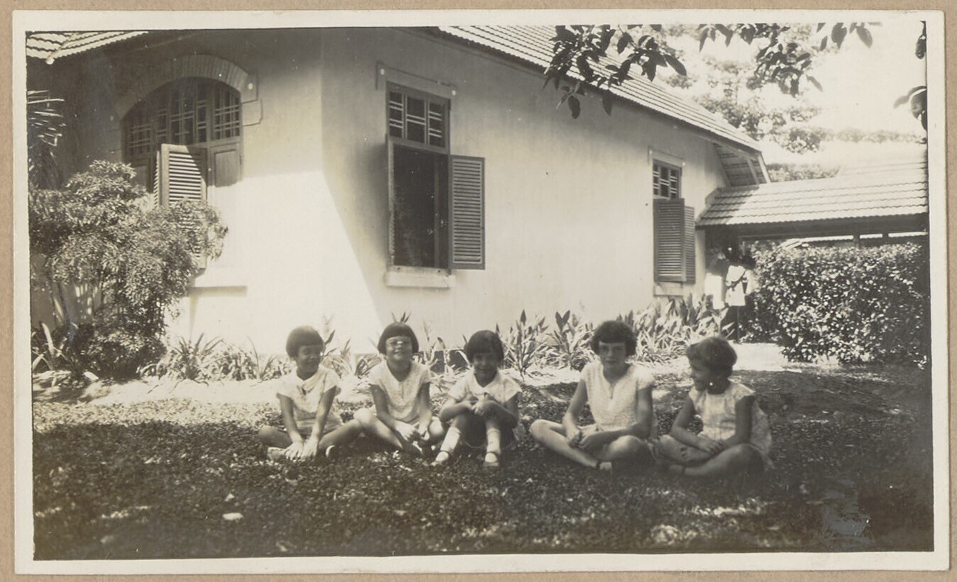 Meisjes zitten op een rij in de tuin