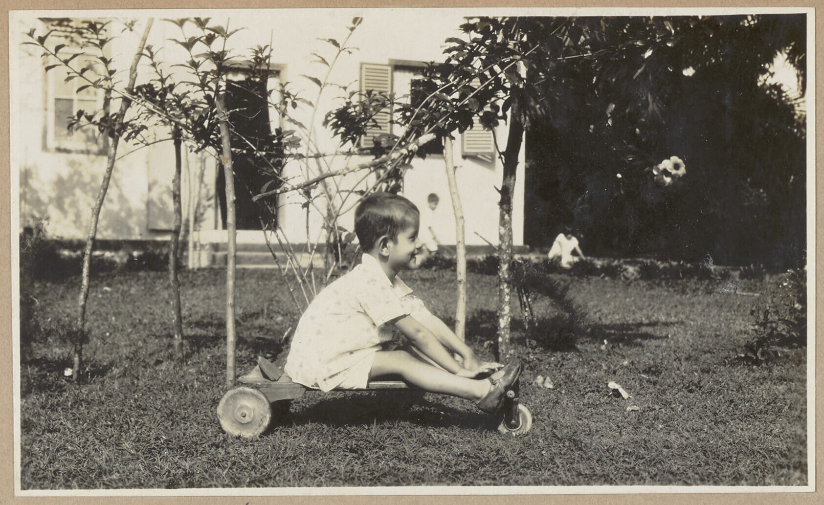Drie kinderen in de tuin met hun speelgoed