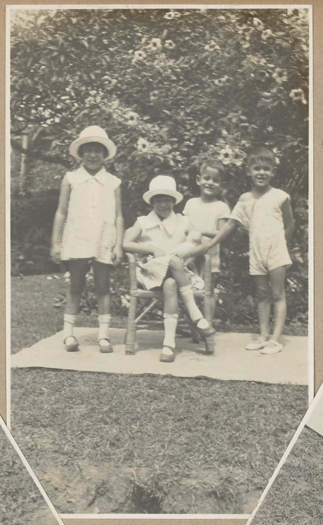 Kinderen poseren op mat in de tuin