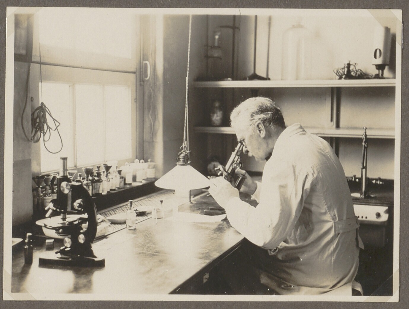Prof. dr. W.A.P. Schüffner achter een microscoop in ...