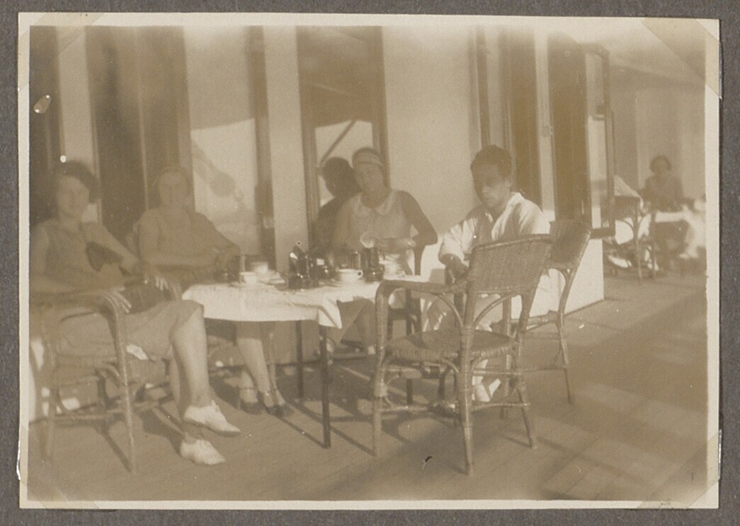 Man en vrouw op terras van pension Lux Vincit te Ban...