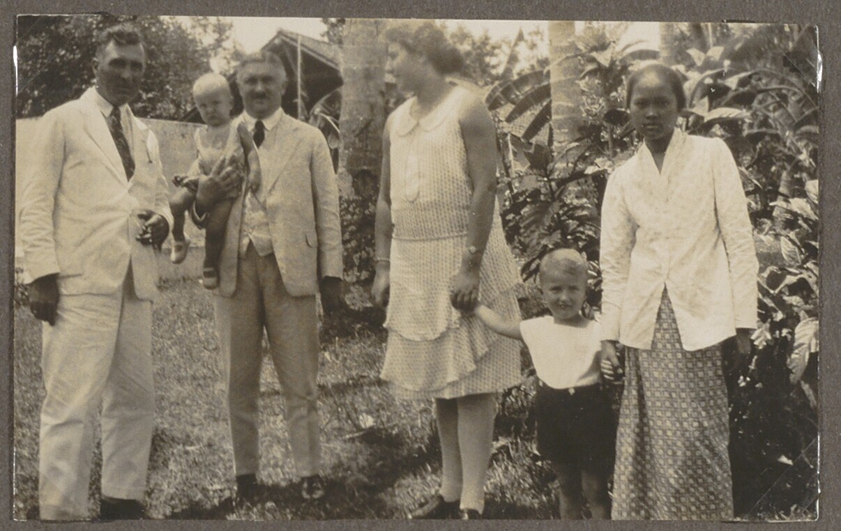 Portret van mensen in de tuin met een kindermeid