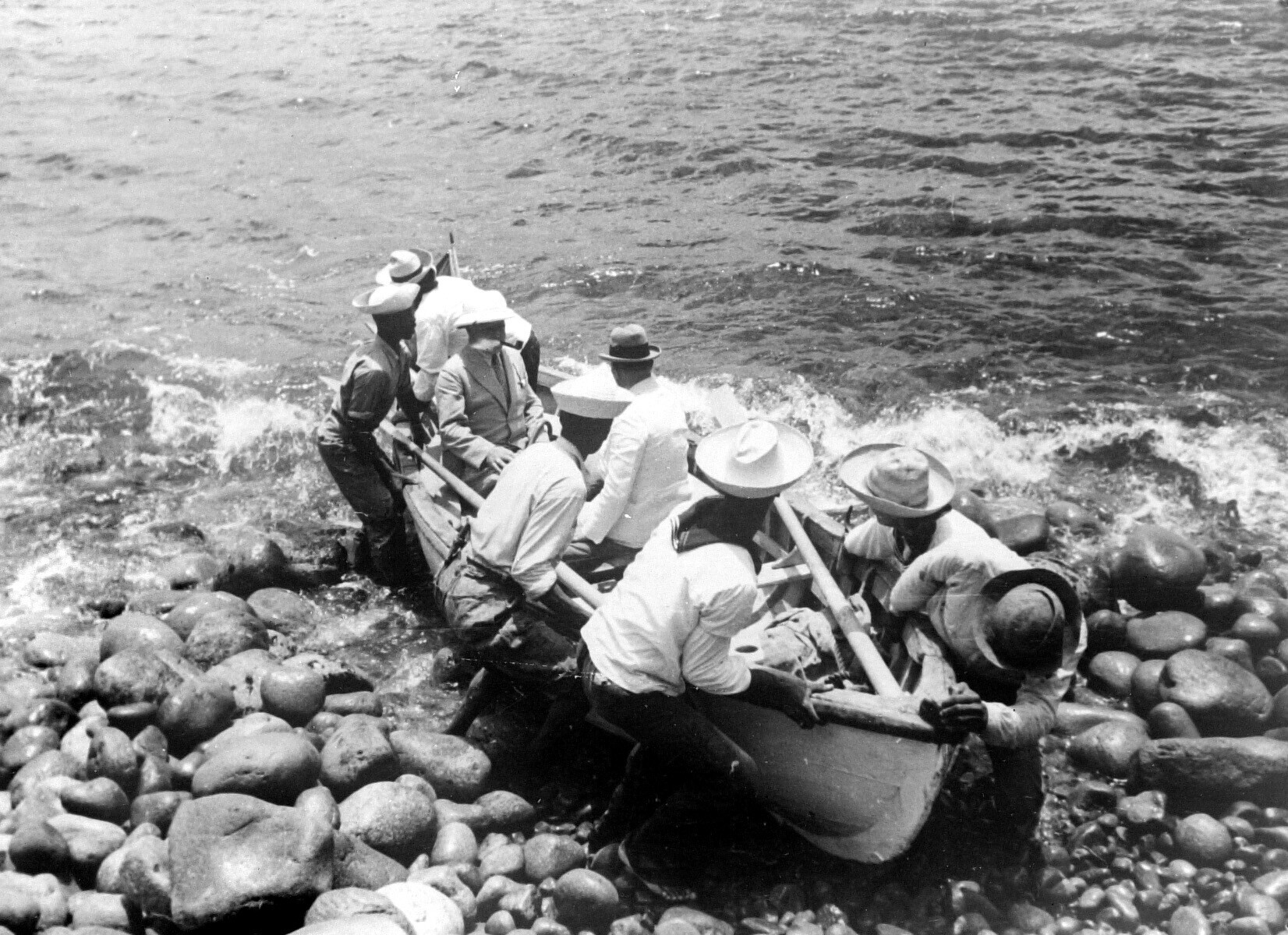 Een roeiboot met passagiers wordt aan land gebracht ...