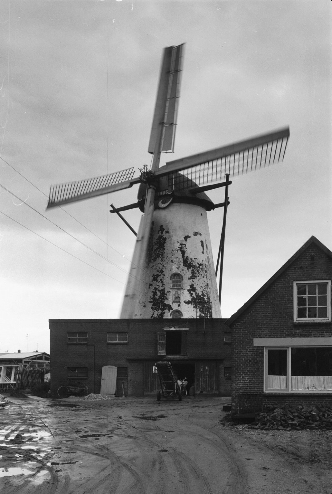 Ronde stenen beltmolen schuin van voren gefotografeerd