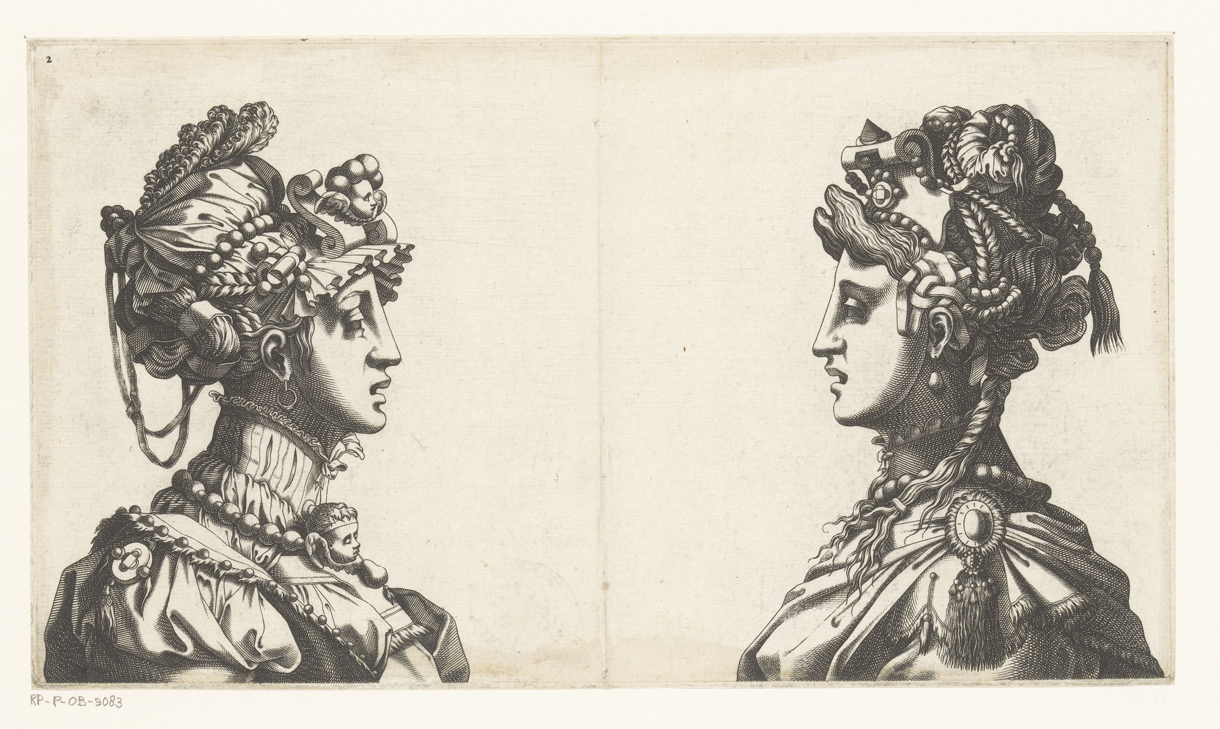 Twee vrouwenbustes met maskers en fantasiehoofdbedek...