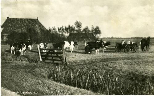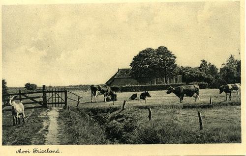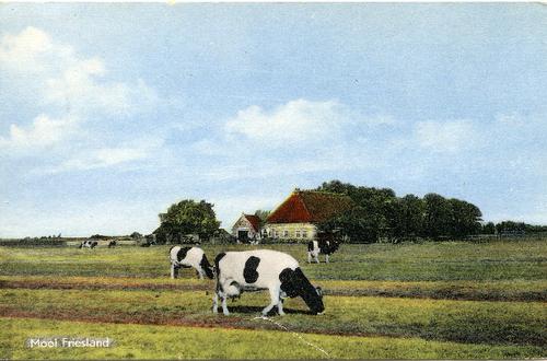 Prentbriefkaart in kleur van koeien in de wei met ve...