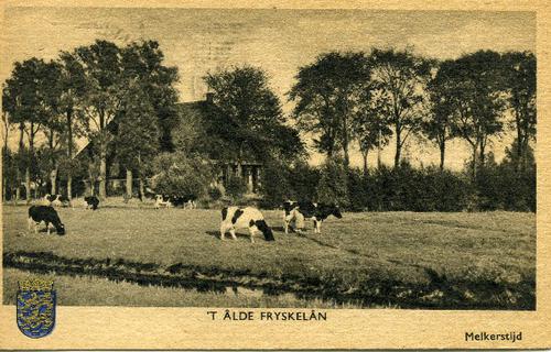Prentbriefkaart in sepia van een melkbocht met koeie...