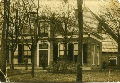 Prentbriefkaart in zwart-wit van een voorhuis
