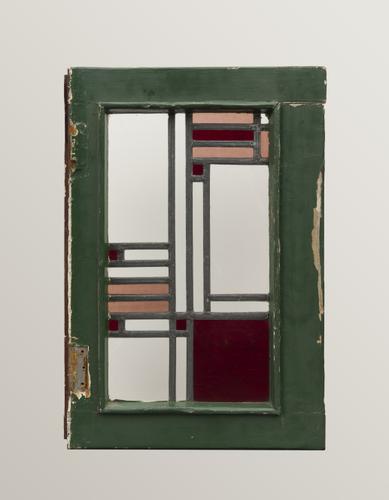 Kozijn met blank en rood glas-in-loodraam
