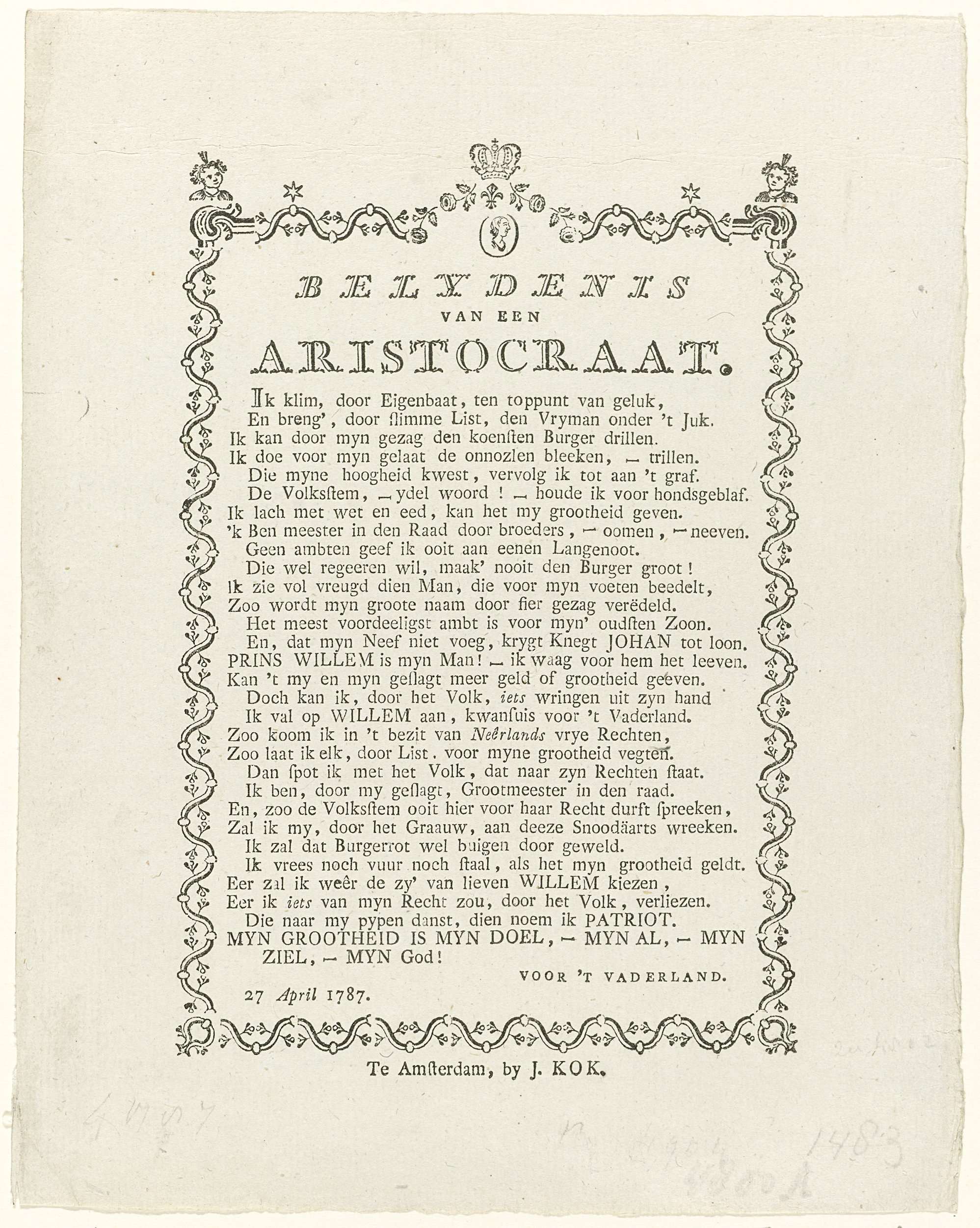 Decoratief blad met vers Willem Gustaaf Bentinck, 1787