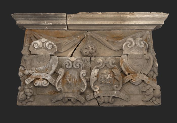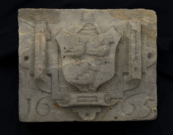 Gevelsteen met wapen drie gekroonde vogels in cartou...
