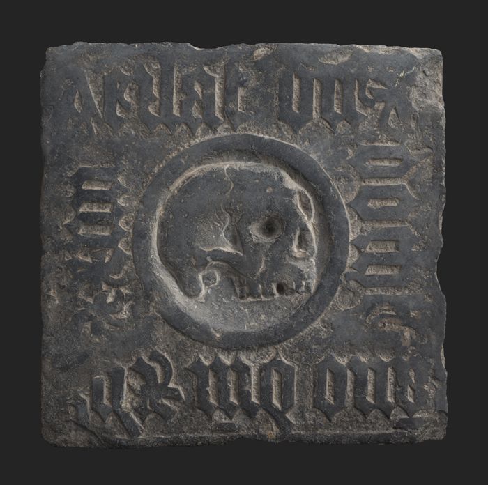 Vierkante grafsteen met gotische tekst en doodshoofd