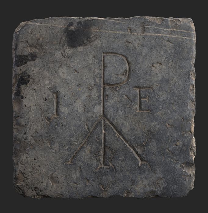 Grafsteentje met initialen "IE" en "P" met twee schu...