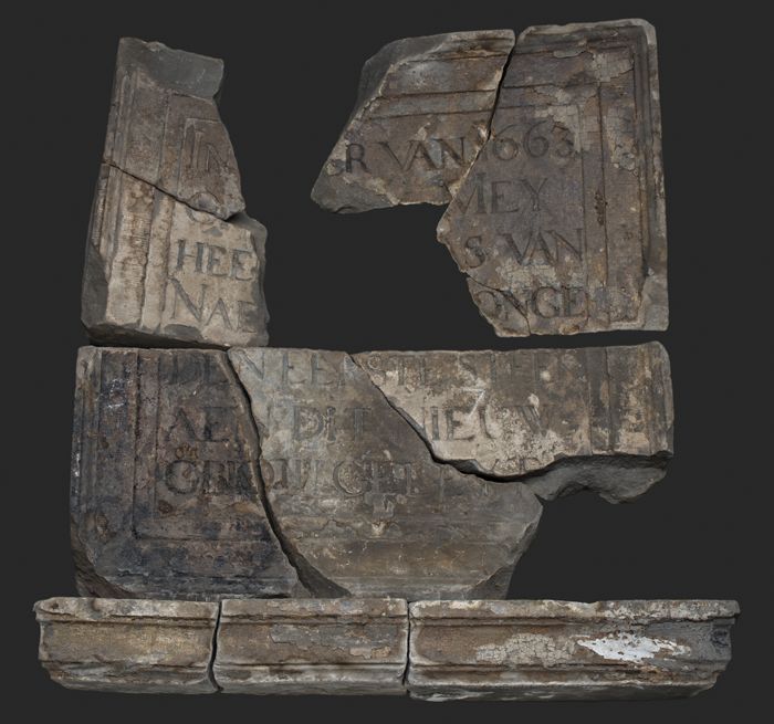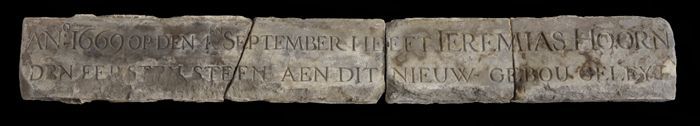 Langwerpige gevelsteen met tekst: "1669 ... Eersten ...