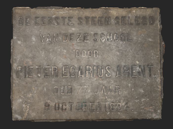 Vierkante gevelsteen in tien stukken met tekst "In ....