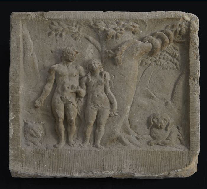 Gevelsteen van zandsteen, Adam en Eva naast boom met...