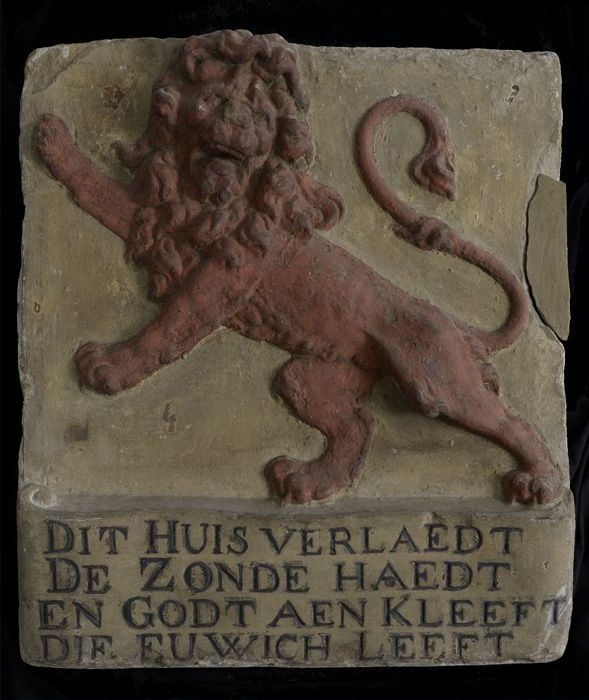 Gevelsteen met rode klimmende leeuw en spreuk "dit h...