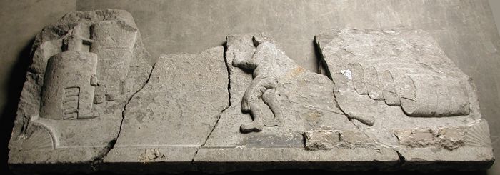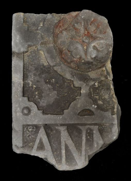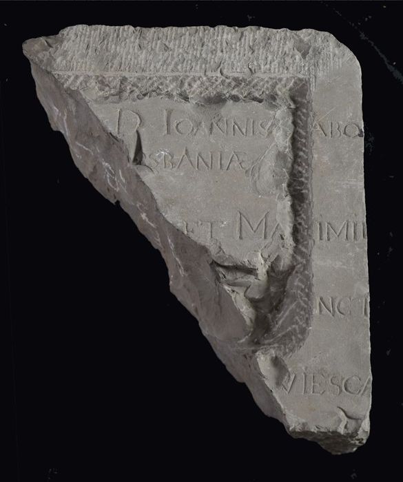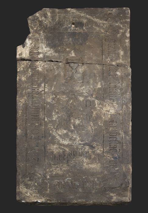 Fundatiesteen van distilleerderij, met druivenranken...