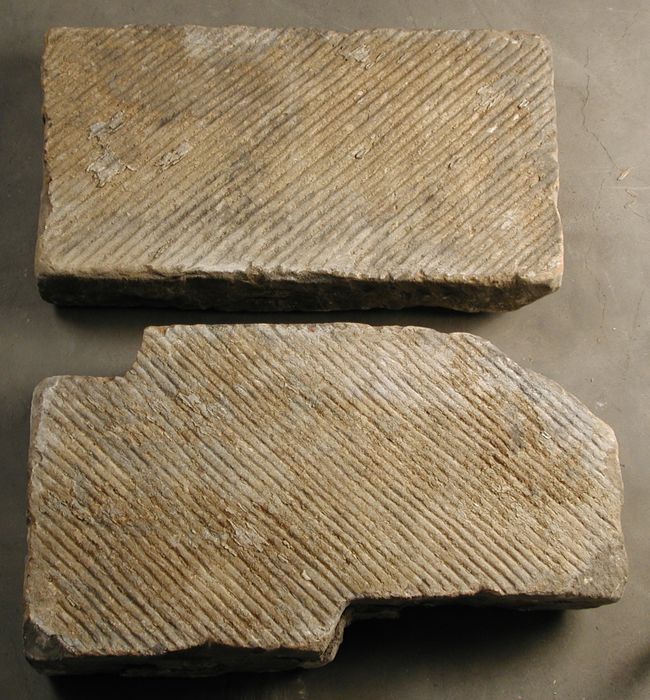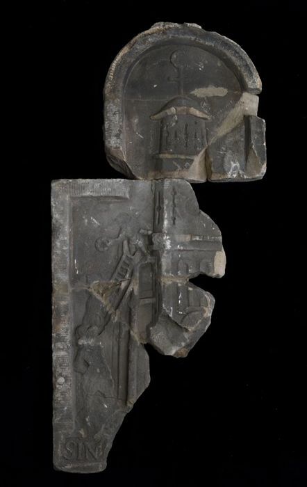 Twee fragmenten gevelsteen met Sint Barbara toren