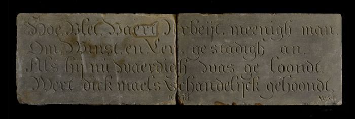 Gevelsteen met tekst "T Sal Soo Niet Blyven"