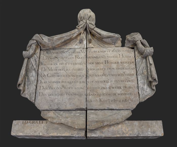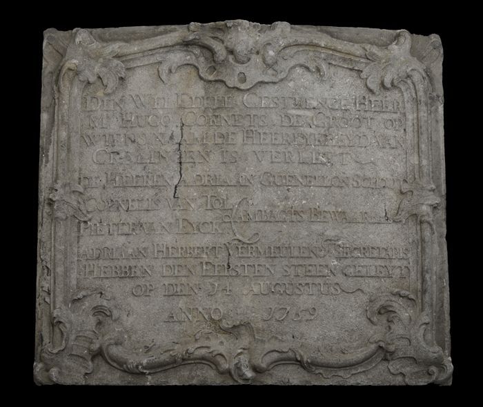 Gevelsteen met "Hugo Cornets de Groot ... 1759 eerst...