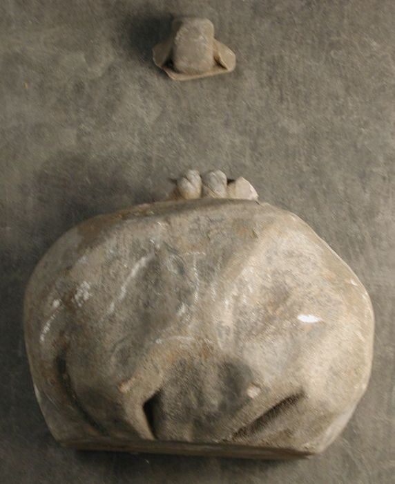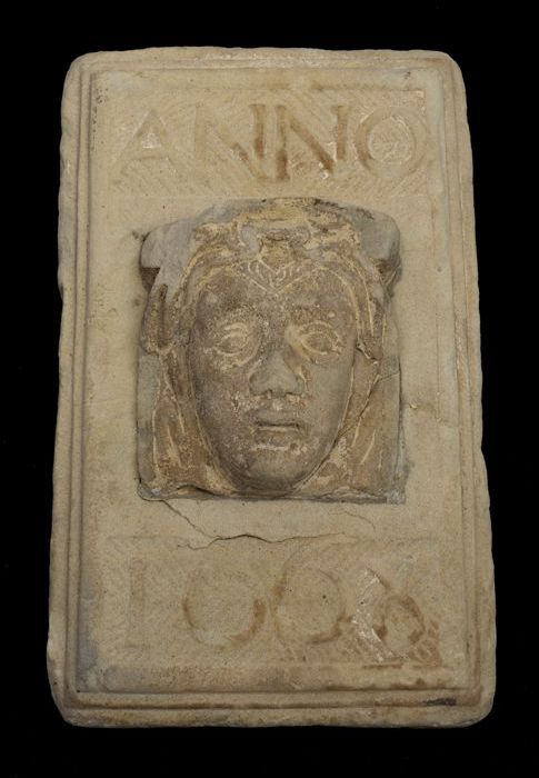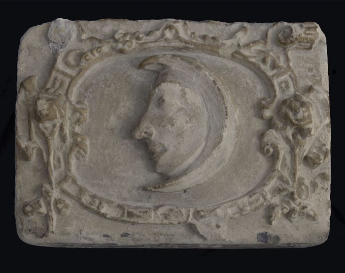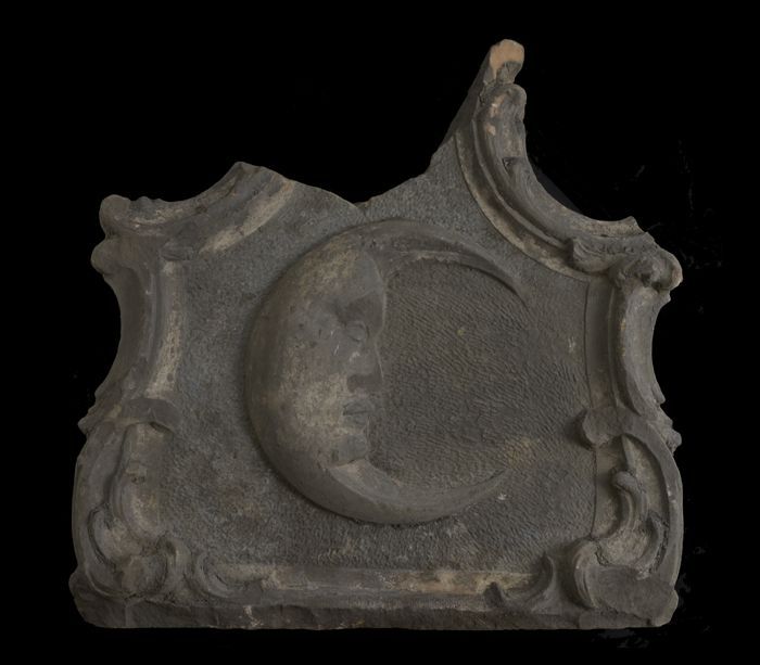 Fragment gevelsteen, halve maan met mensengezicht in...