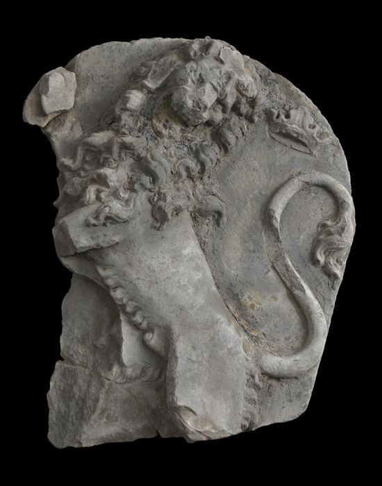 Gevelsteen met leeuw met voorpoten op staand vat