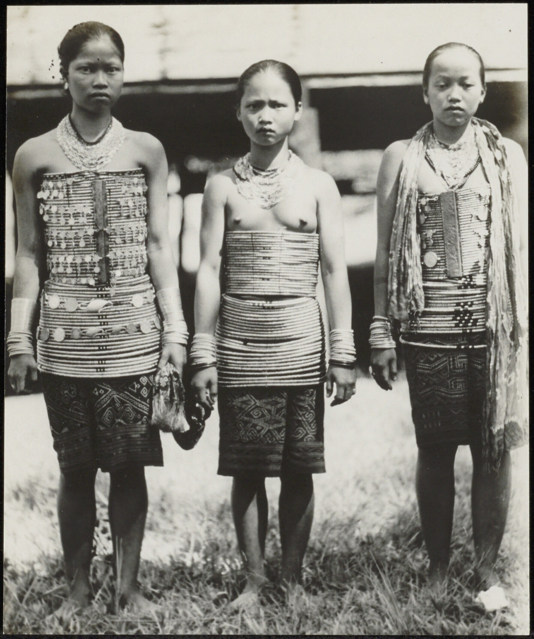 Groepsportret van Dayak meisjes met een corset van b...