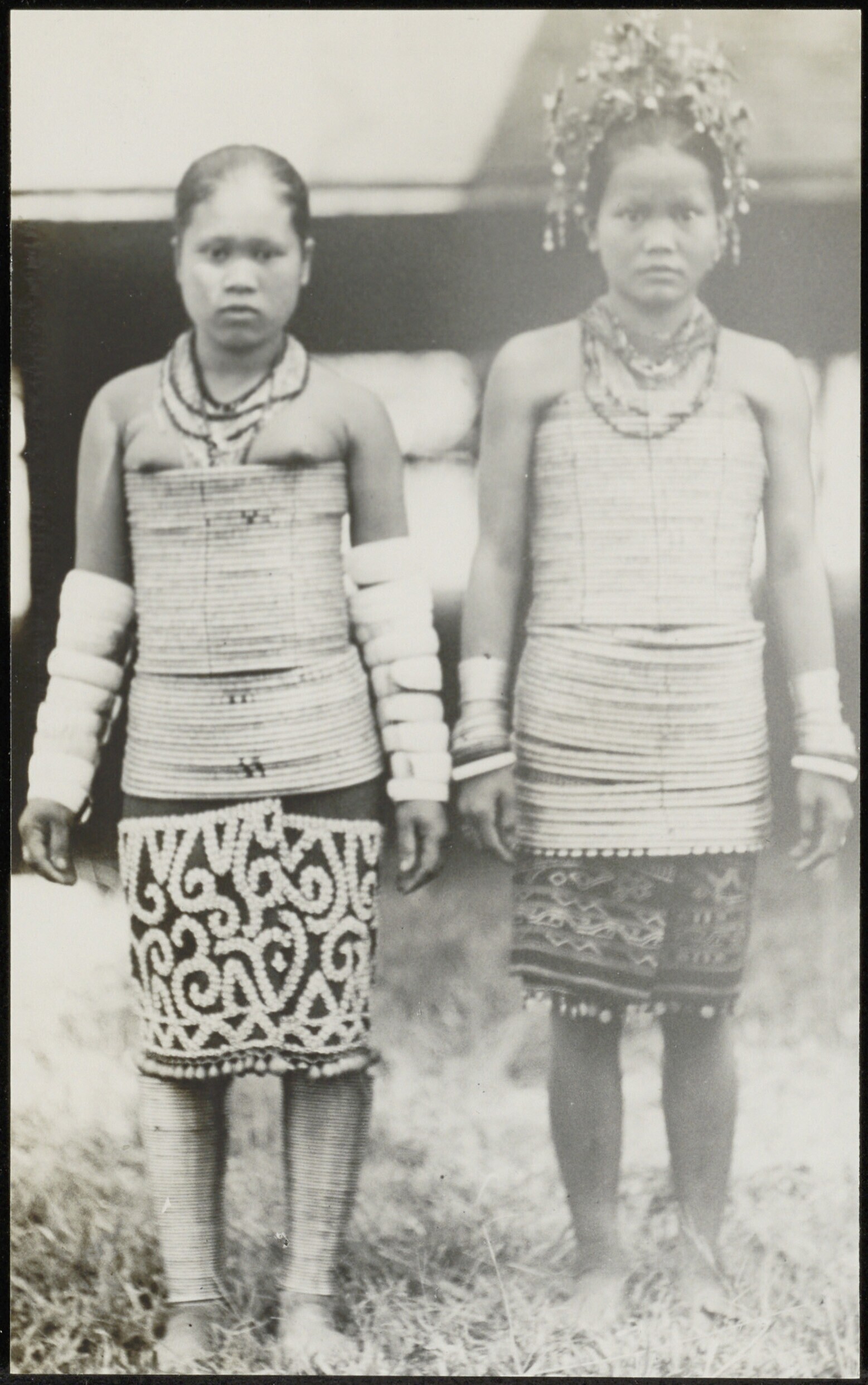 Groepsportret van twee Dayak meisjes met kledingstuk...