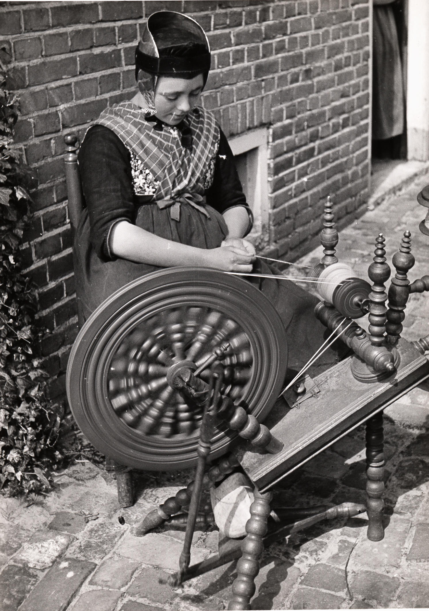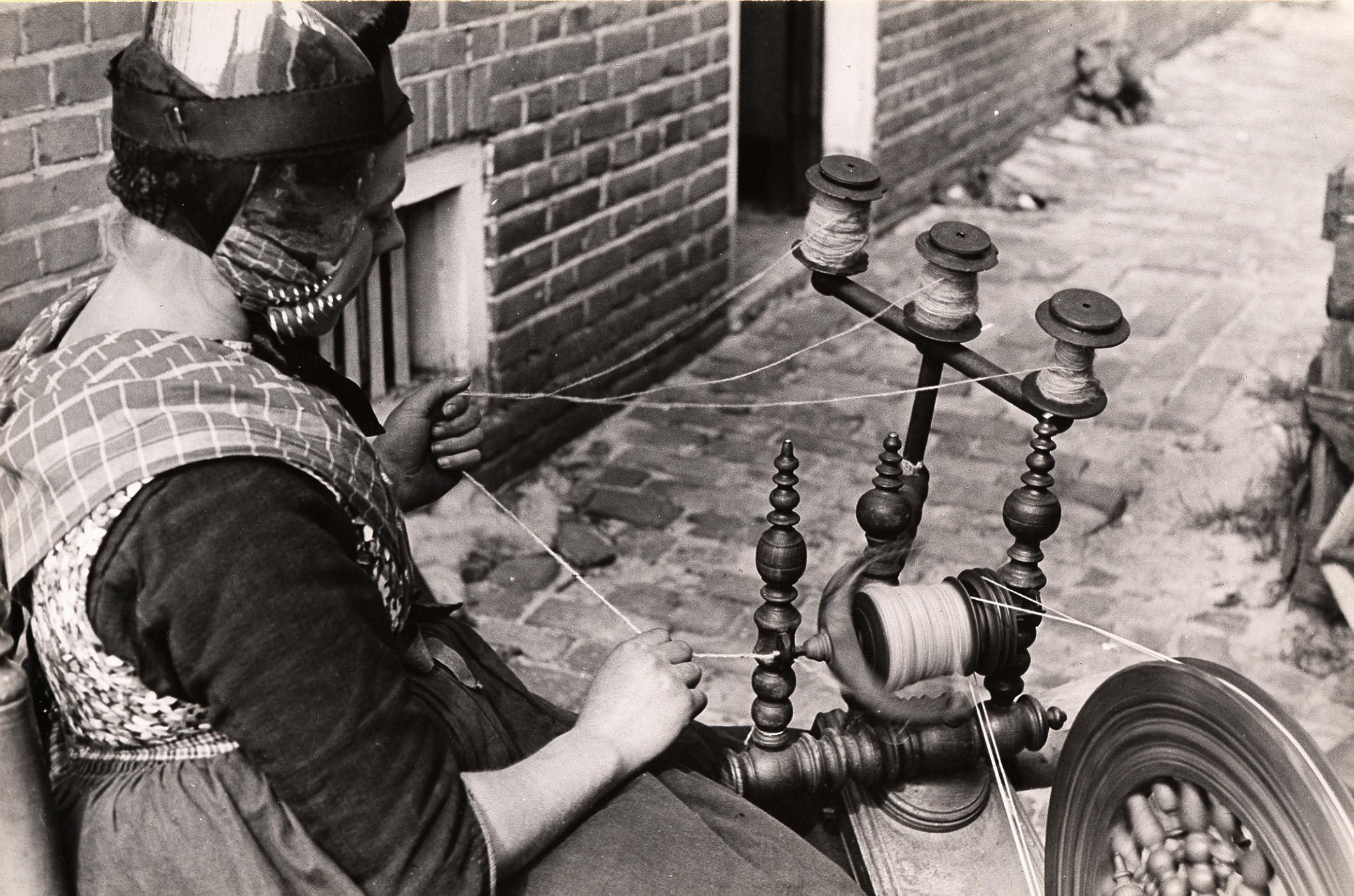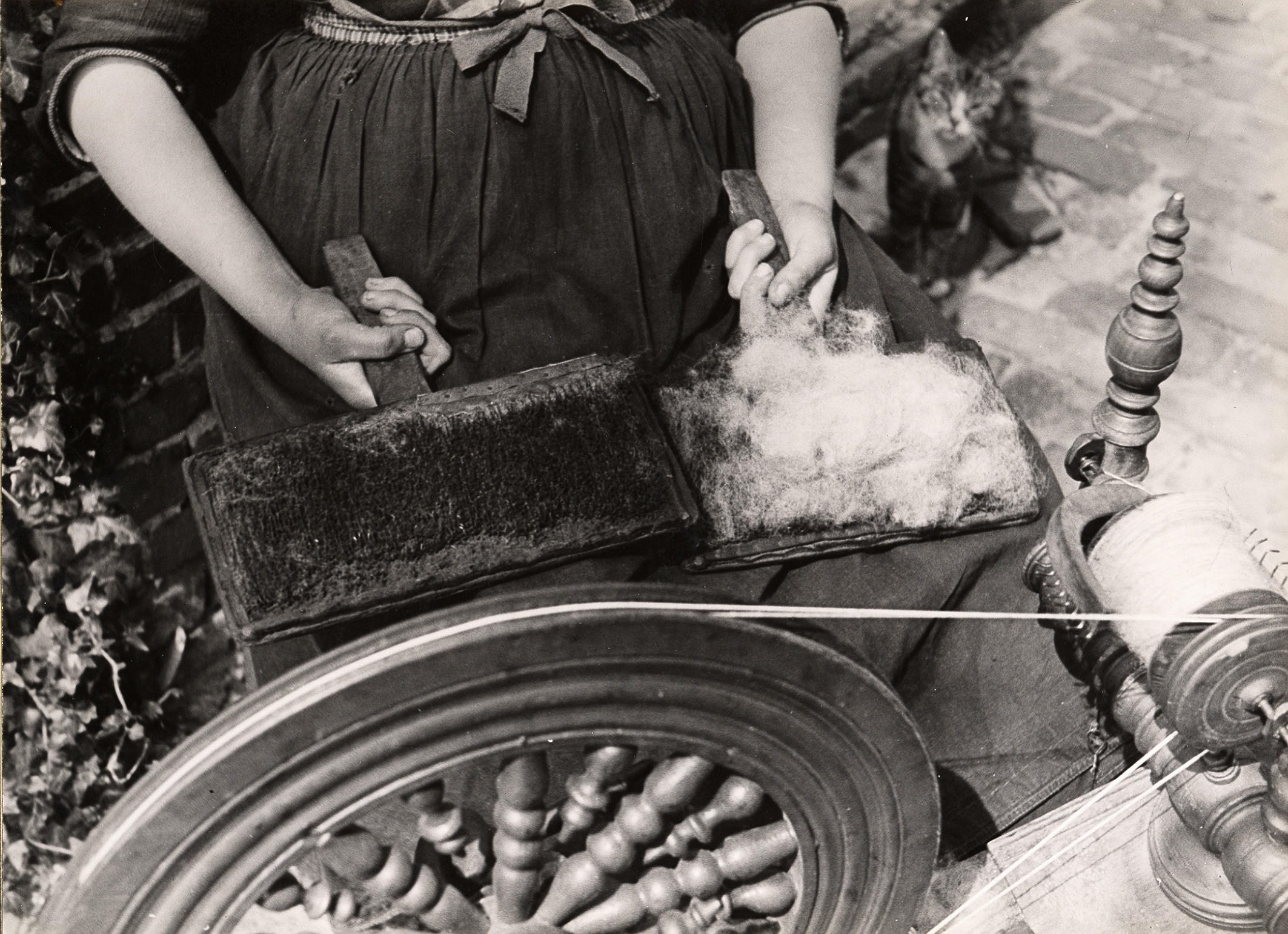 Spinnen van wol, Rouveen, 1944 (zwart-wit foto)