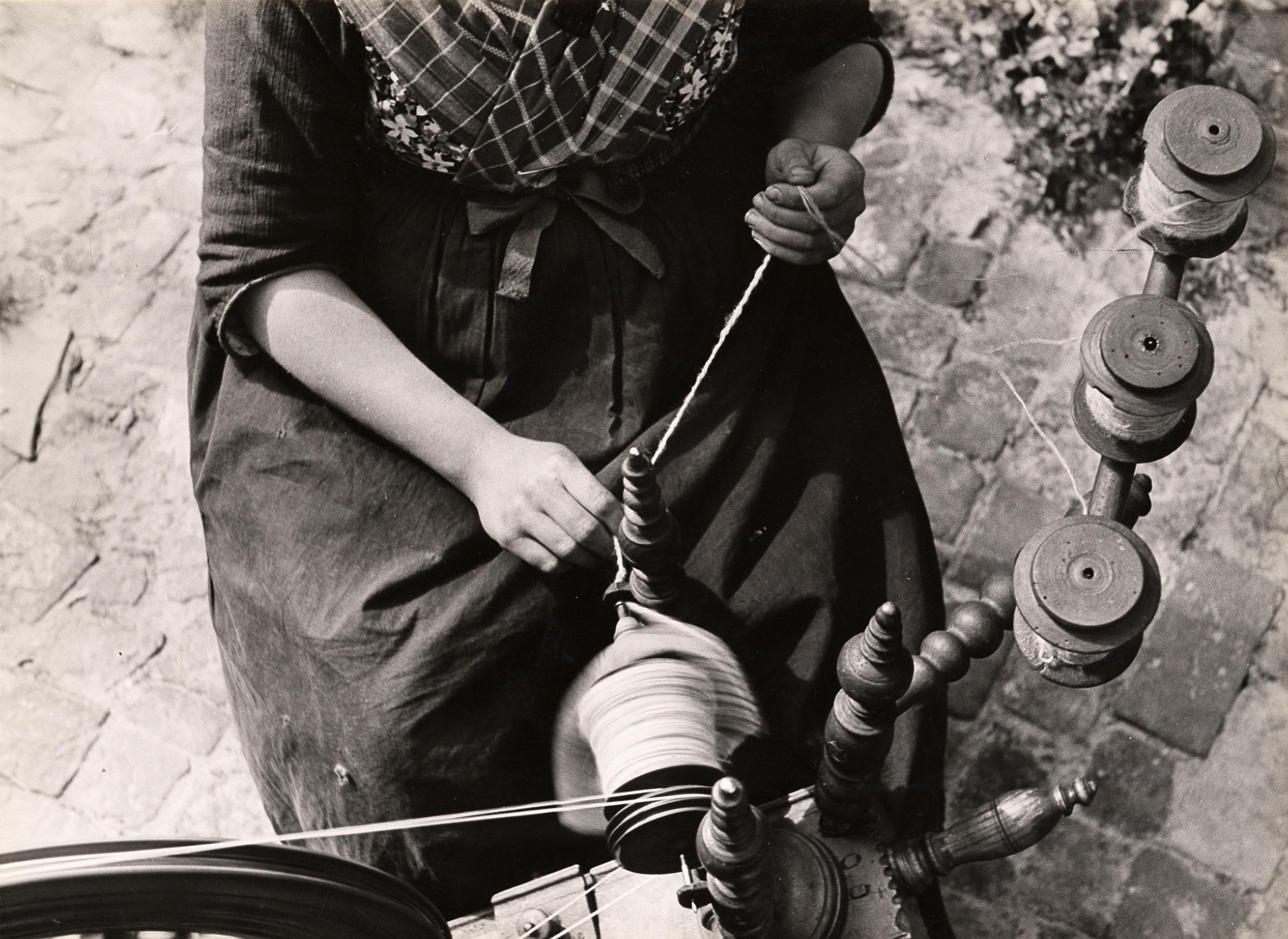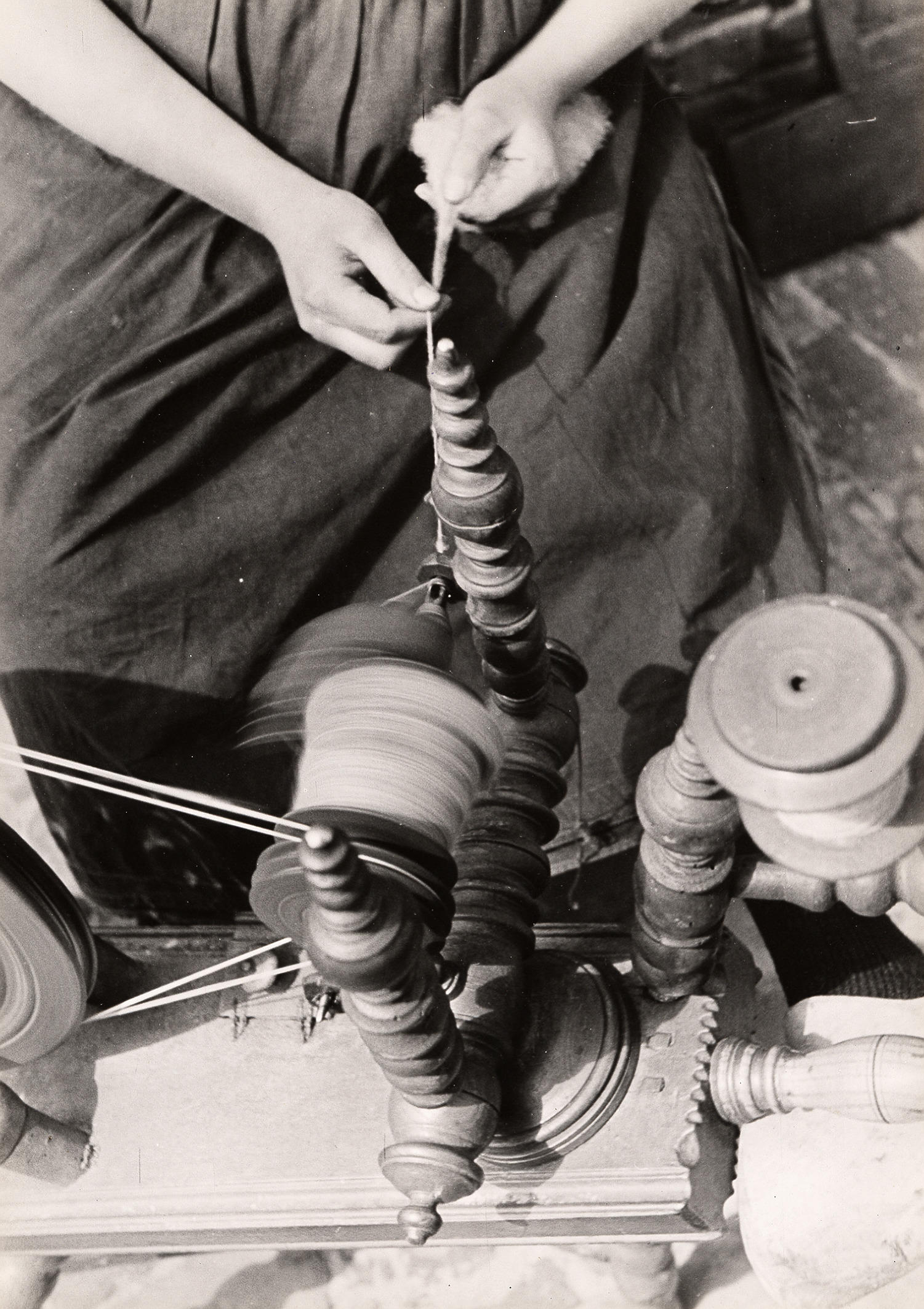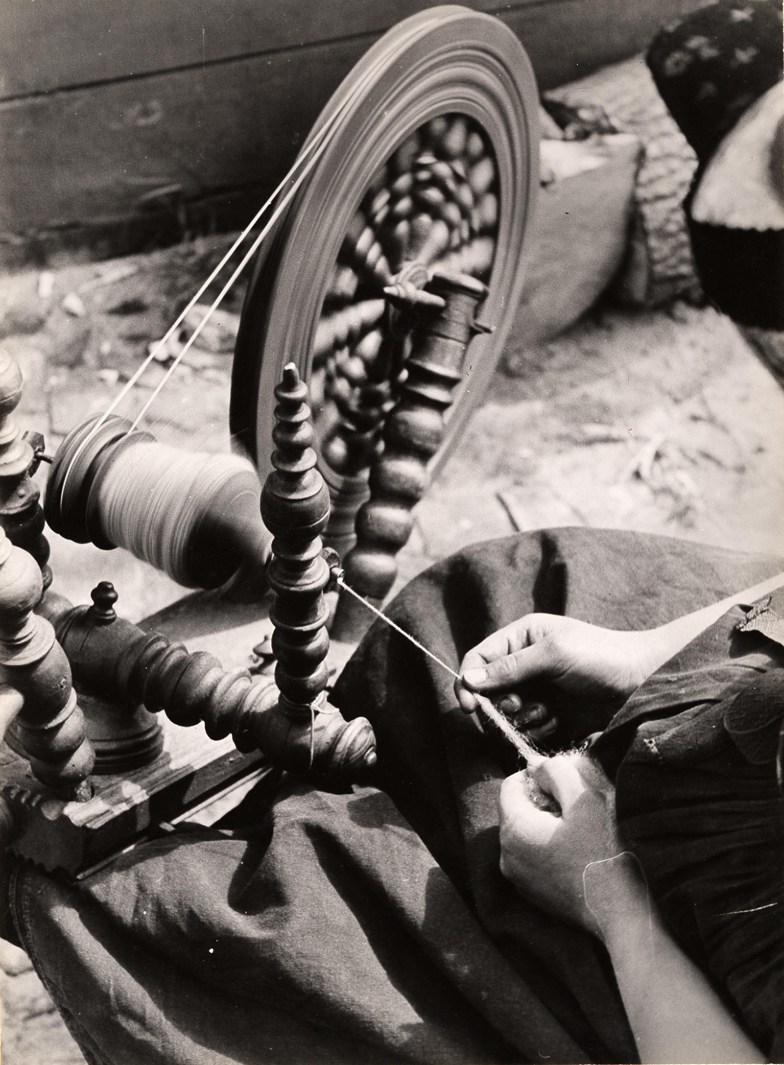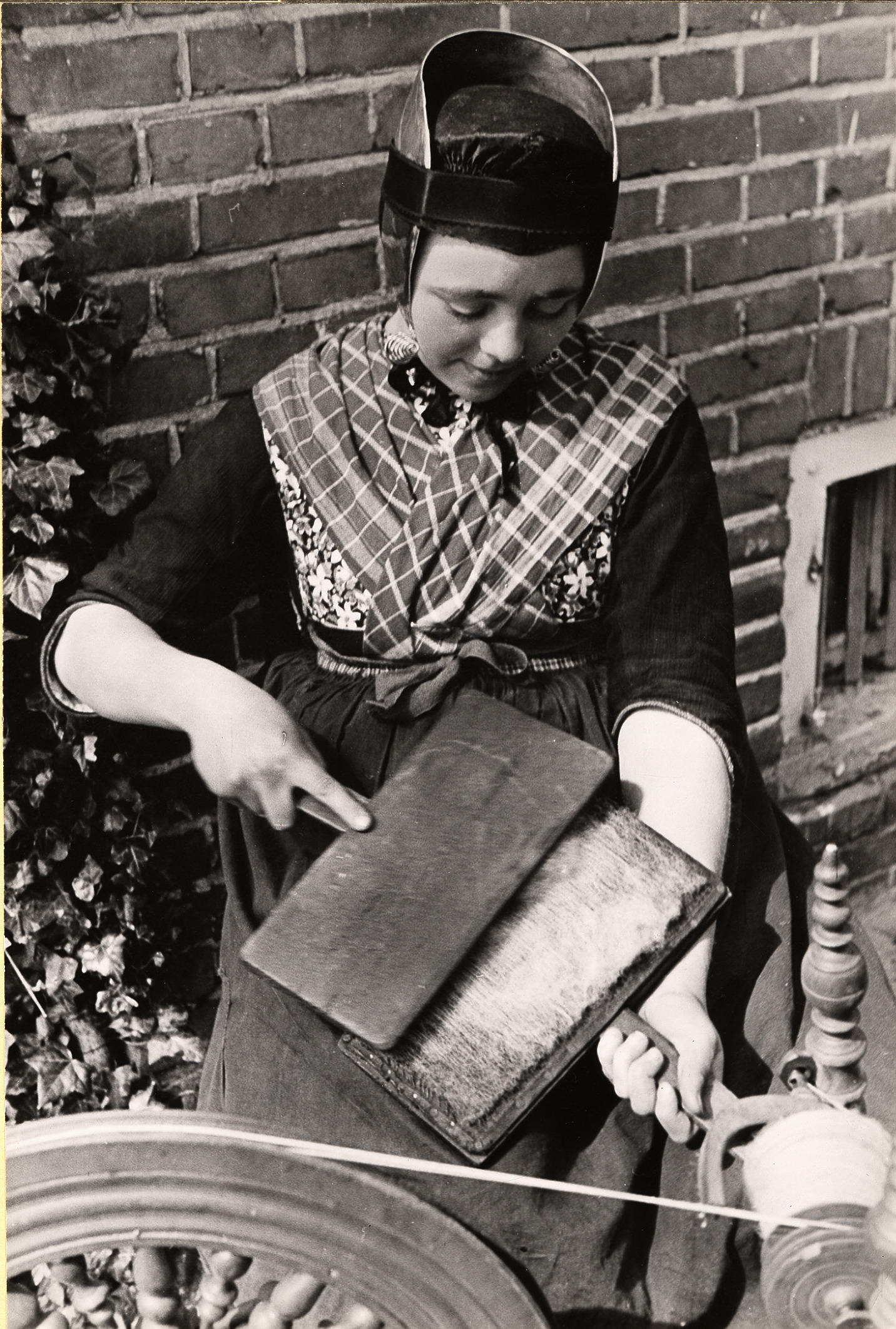 Spinnen van wol, Rouveen, 1944 (zwart-wit foto)
