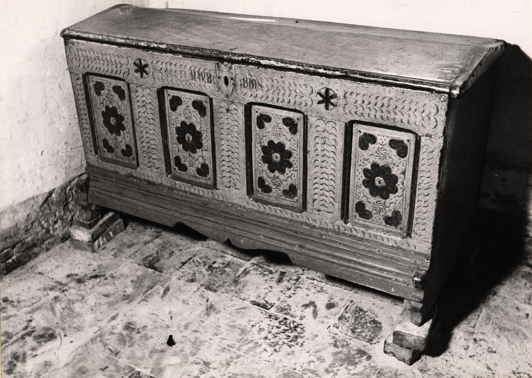 Houten kist met snijwerk, Staphorst, 1944 (zwart-wit...