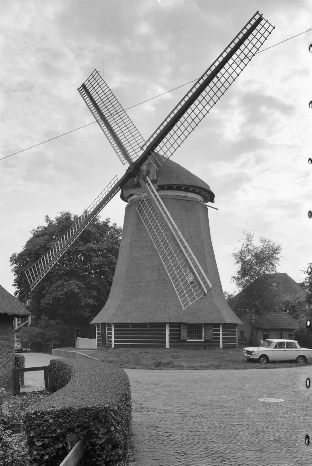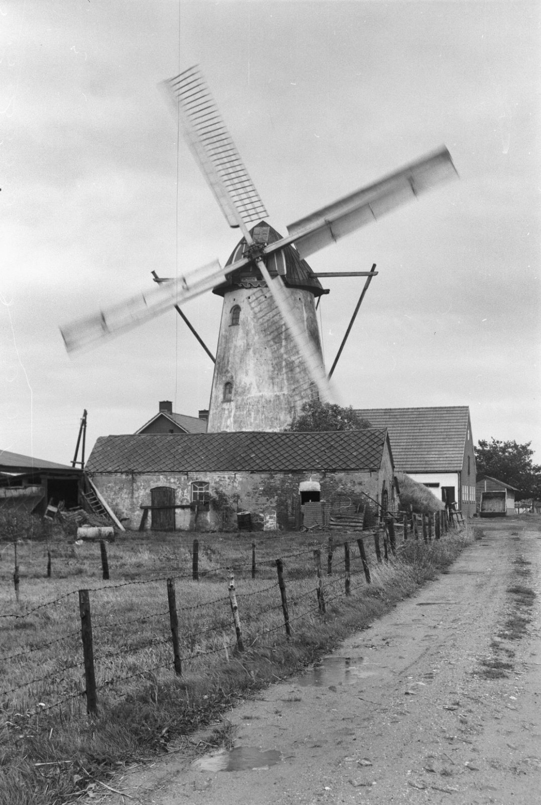 Ronde stenen beltmolen met draiiende wieken van vore...