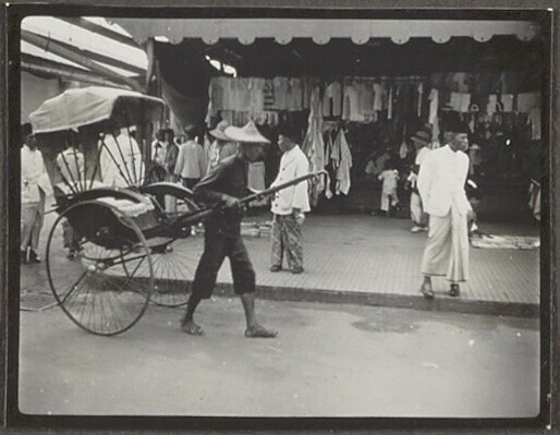 Straatgezicht met een rikshaw en een kledingwinkel i...