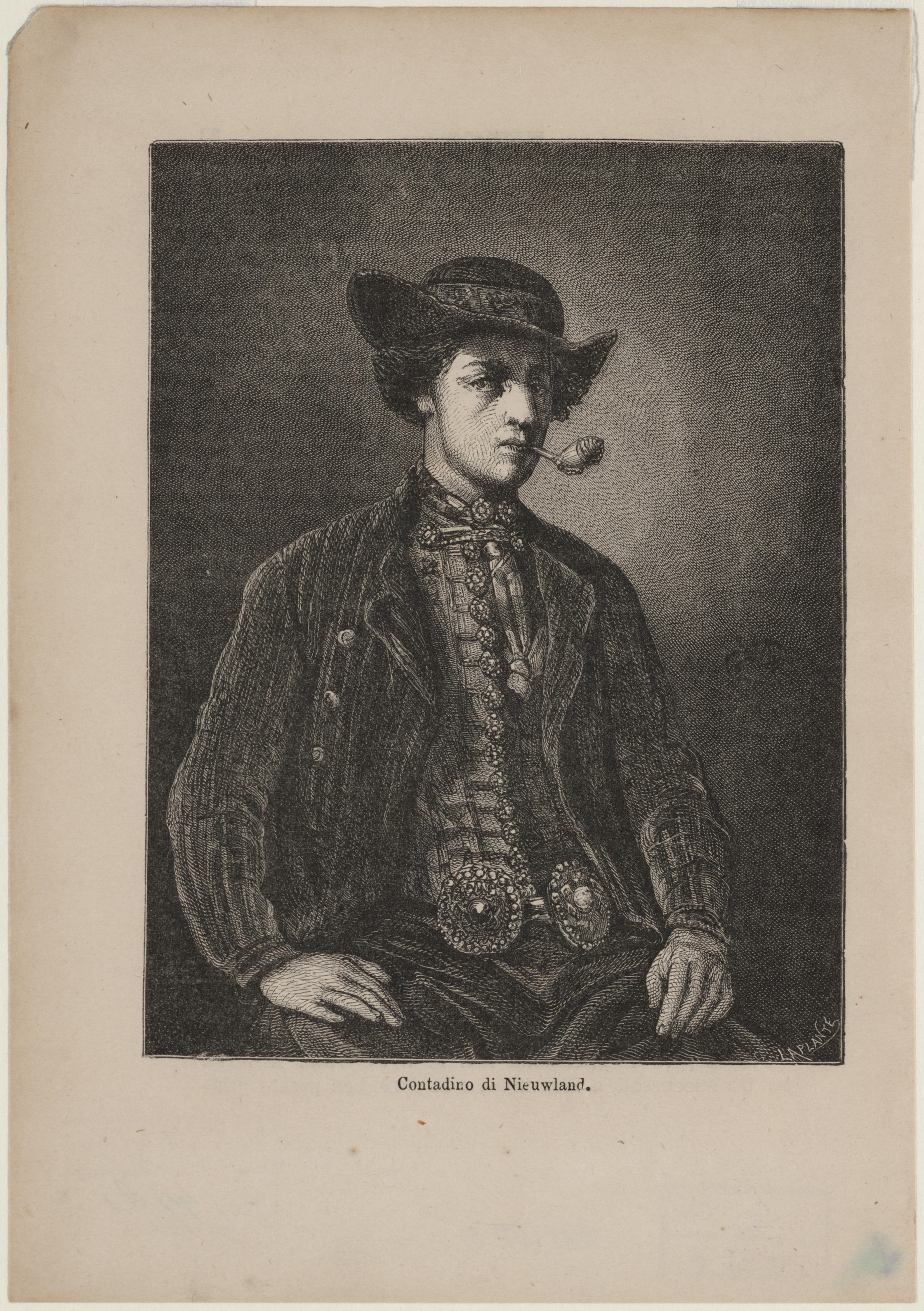 Houtgravure van een meisje in Zuid-Bevelandse dracht...