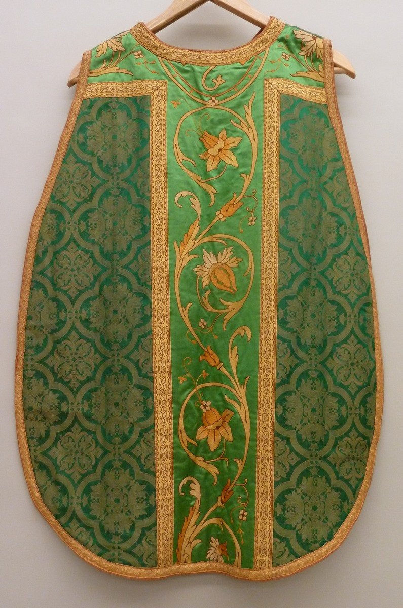 Geel kazuifel met groen fluwelen gaffelkruis, gevoer...