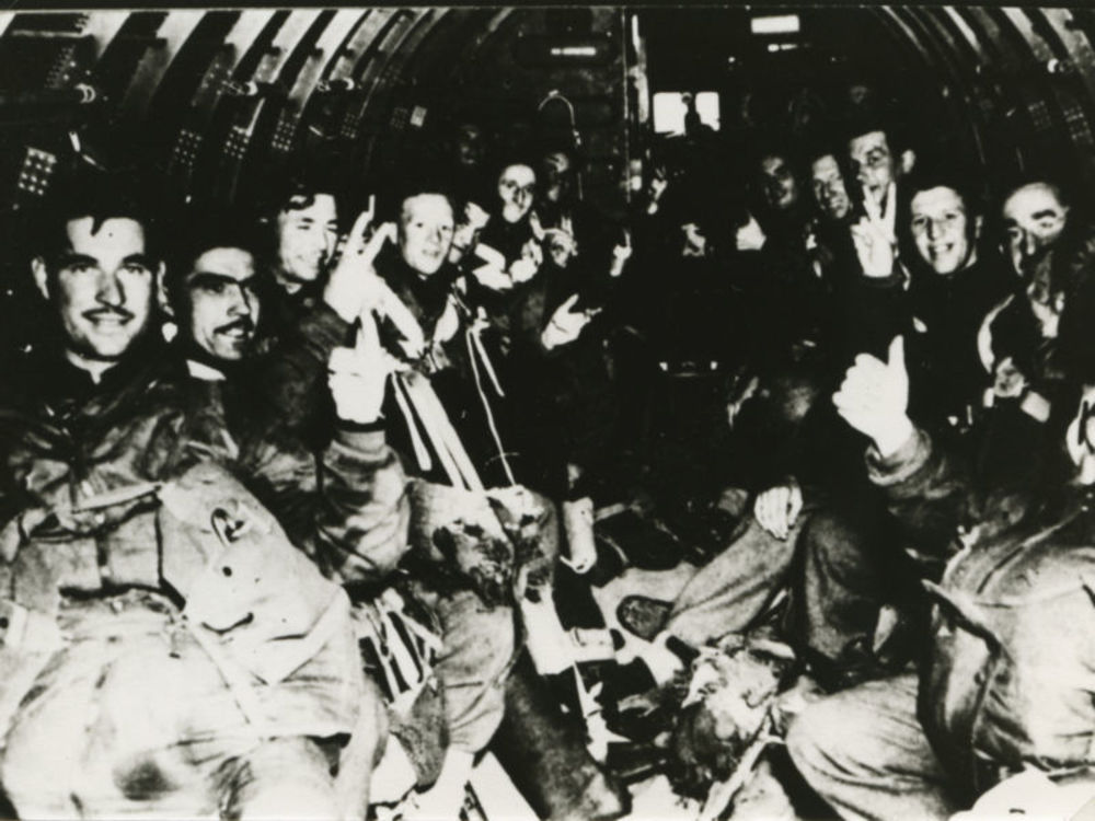 Foto Britse parachutisten in C-47 Dakota op weg naar...