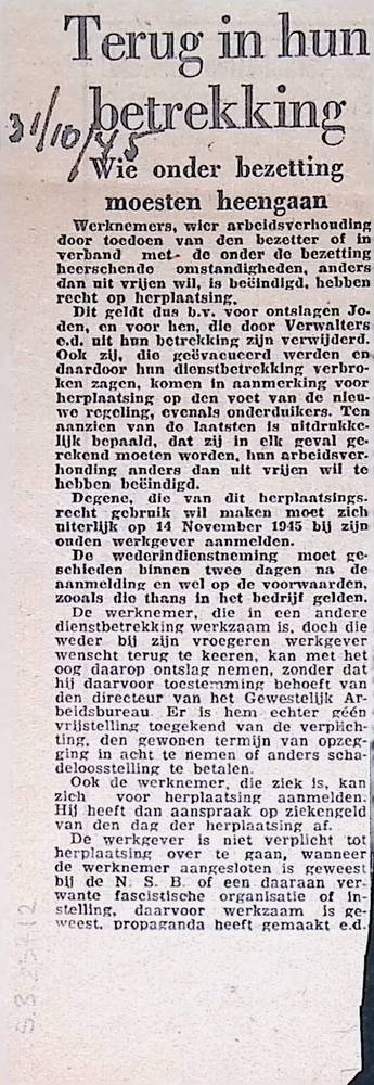 Krantenknipsel 'Terug in hun betrekking' 31 oktober ...