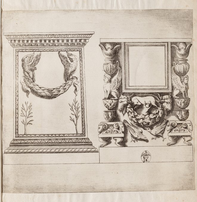Ornamentprent. Twee altaren of steles ('Album Podest...
