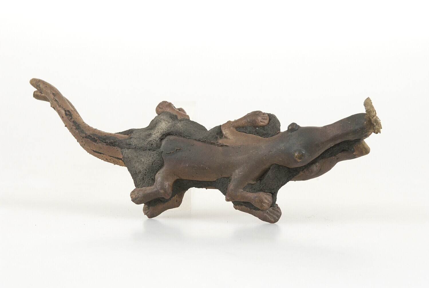Gietwerkvoorbeeld van twee krokodillen, nog met klei...
