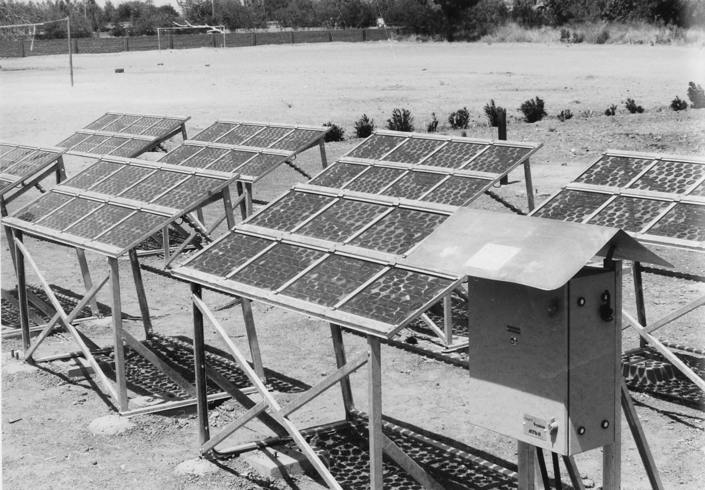 Overzichtsopname van zonnepanelen en een stroomomvor...