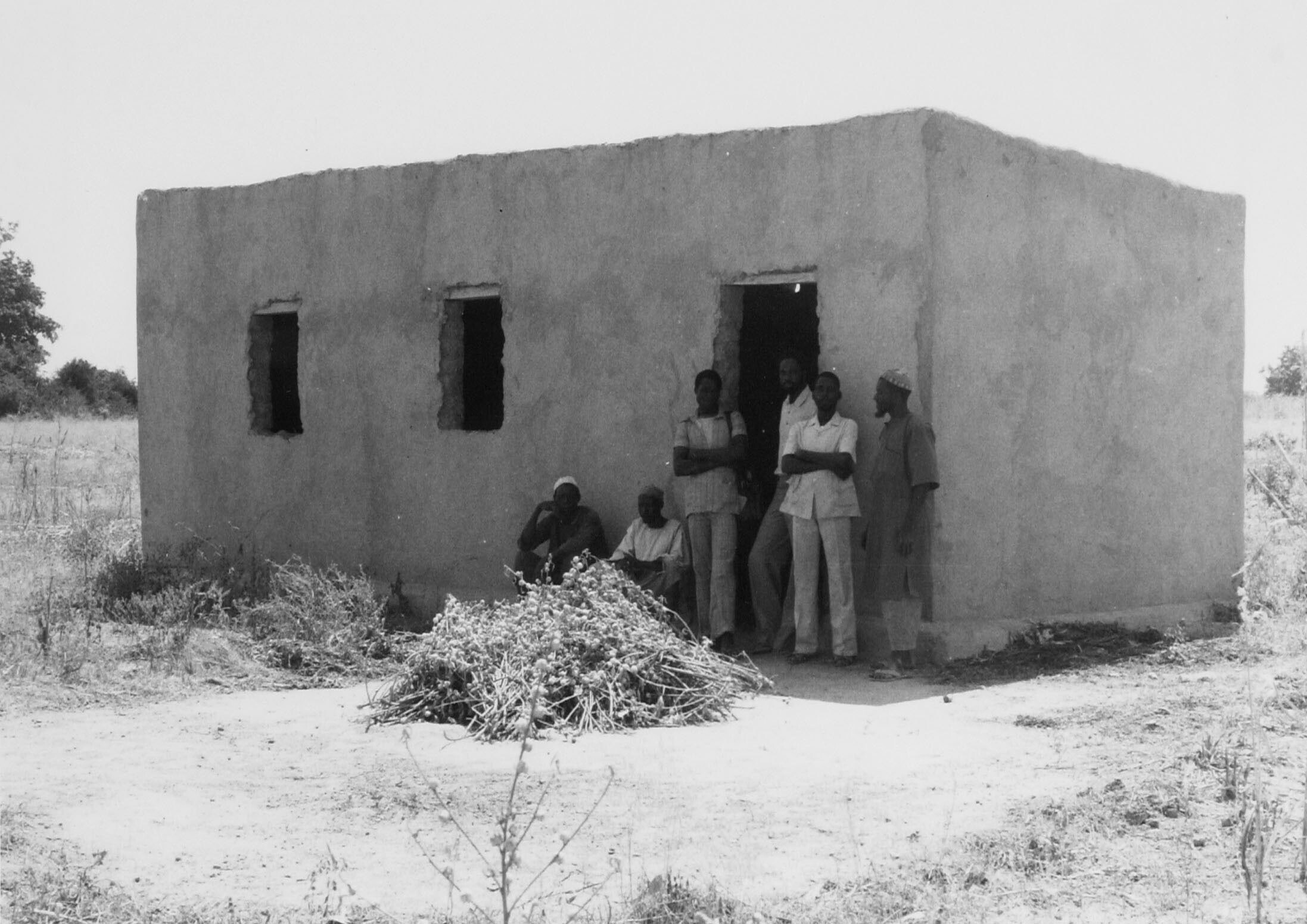 Mannen poseren voor een 'moderne' woning in de regio...
