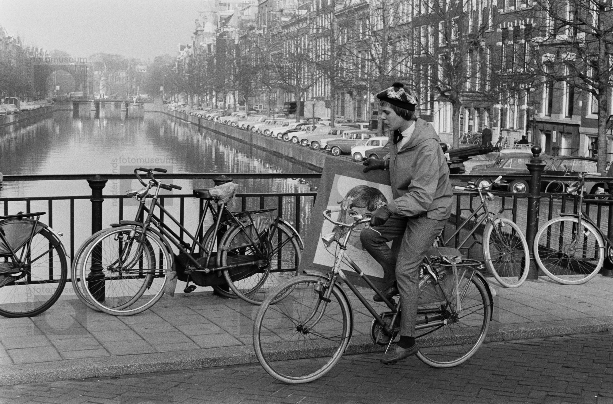 Amsterdam. Meisje op fiets met schilderij onder de arm