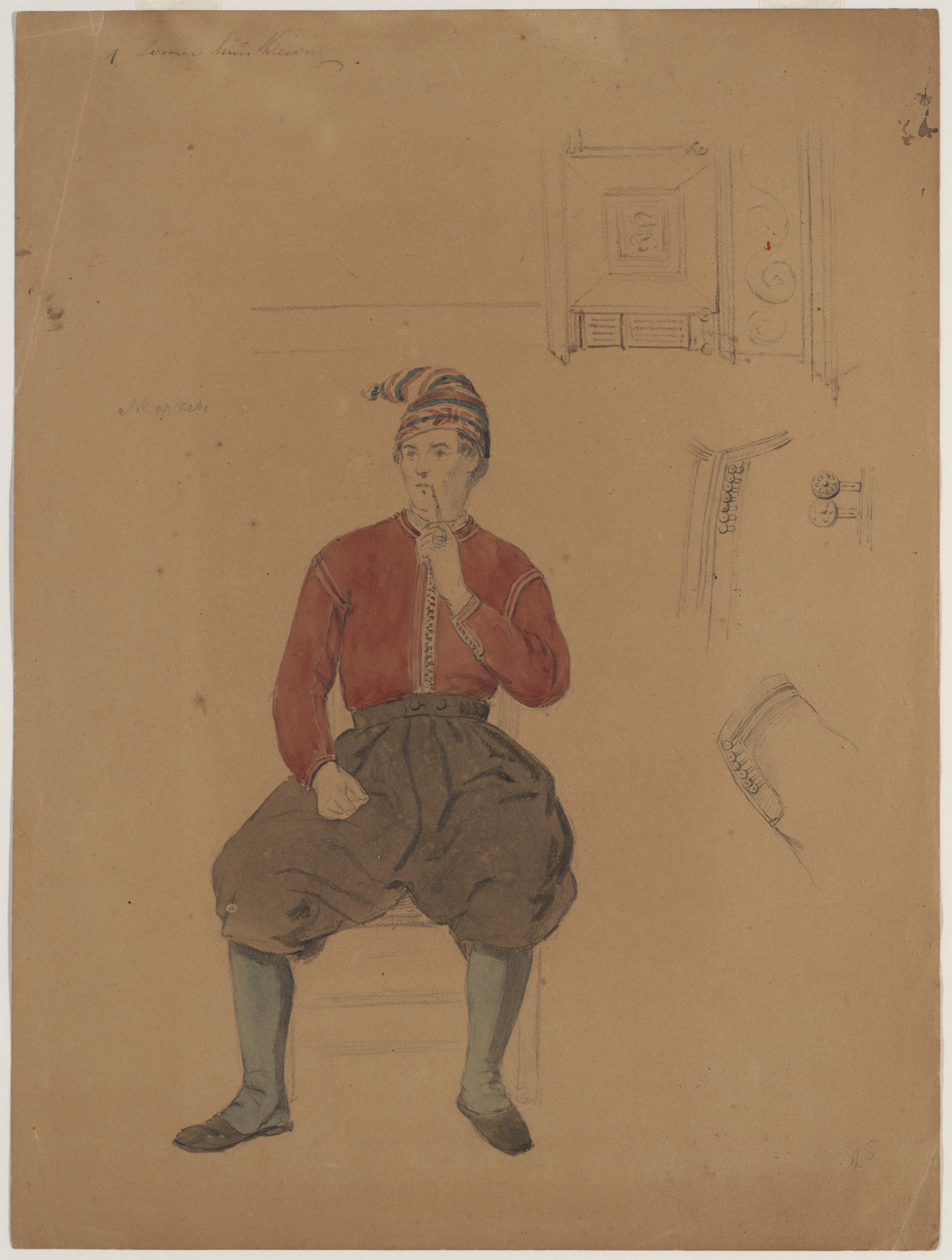 Zittende man in zomer-huiskleding van Marken